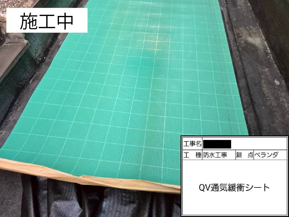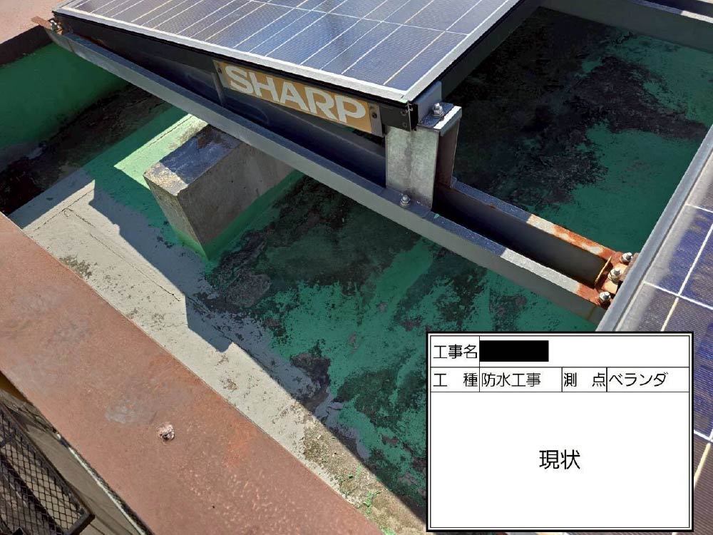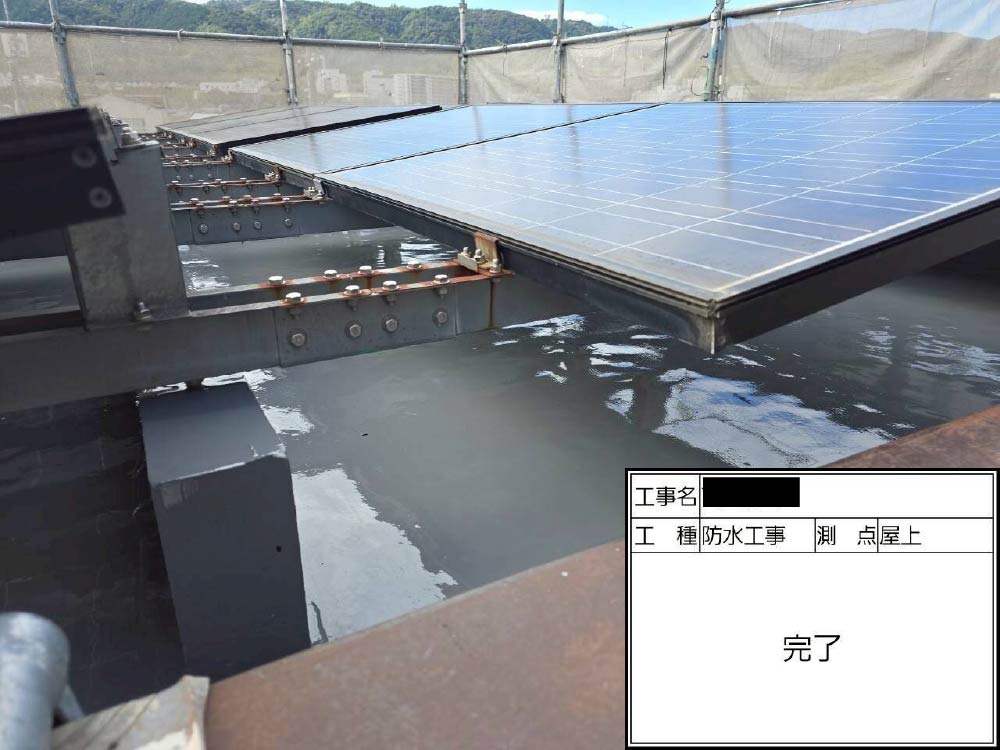 太陽光パネルが設置された屋上に、通気緩衝工法により防水を施しました。