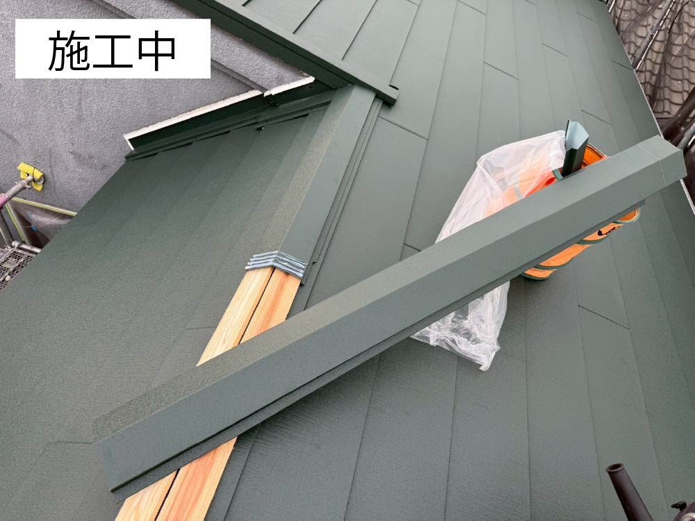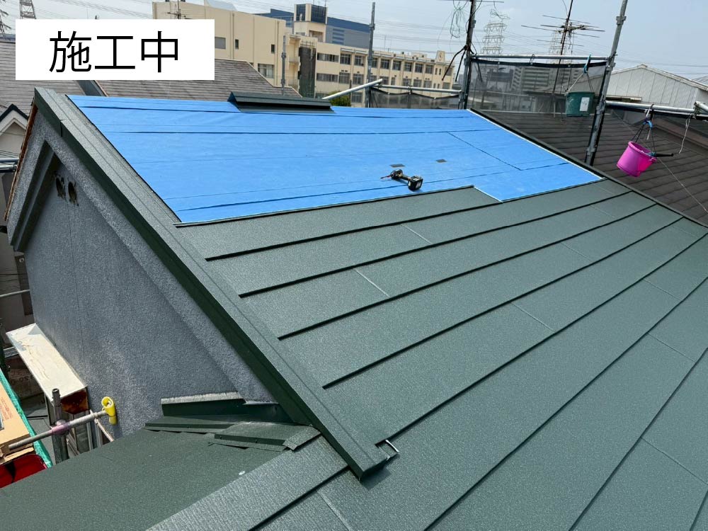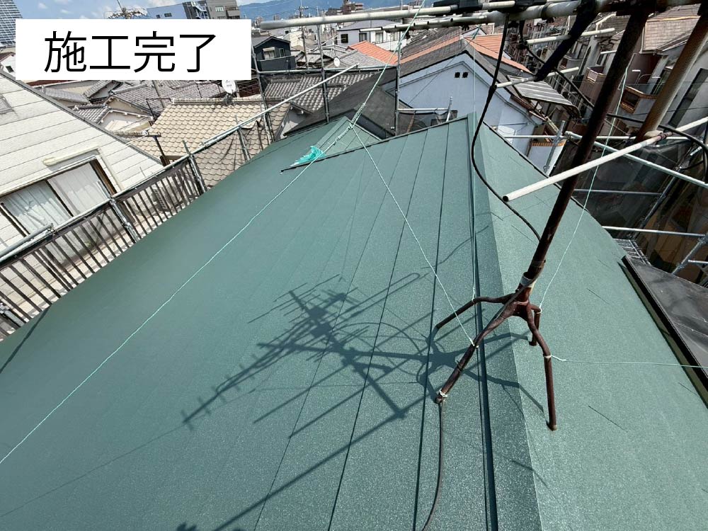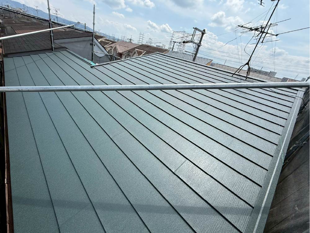 色褪せの目立つスレート屋根をおしゃれなグリーンの屋根材で葺き替えました。