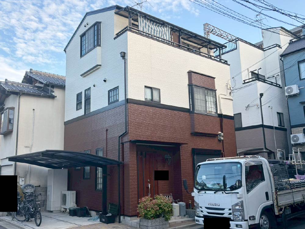 | 使用塗料 | 外壁:RSシルバーグロスSi(1F:RS-385、2F:RS-110) 屋根:RSルーフ(チョコレート) |